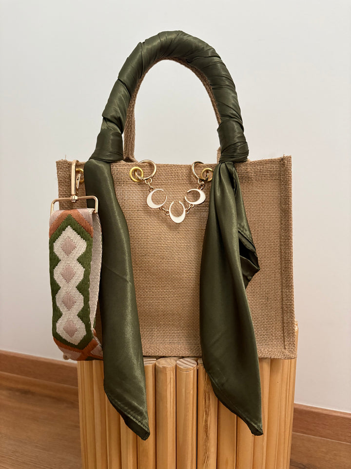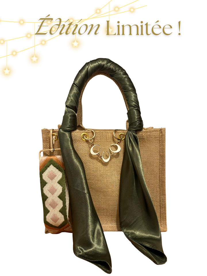 Un design élégant, sublimé par des anses habillées de satin kaki profond et un bijou assorti faisant toute la différence.