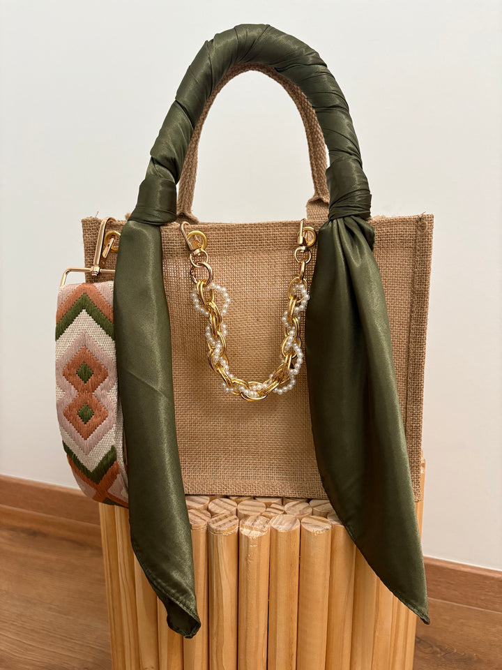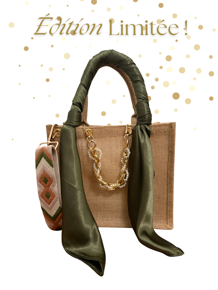Un design élégant, sublimé par des anses habillées de satin kaki profond et un bijou assorti faisant toute la différence.